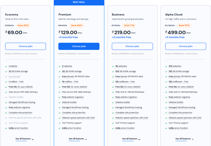 Hostinger IndiaIndian data centre, UPI payments, AI-builderExcellent value, strong speed & uptime Some advanced features are locked to higher plans