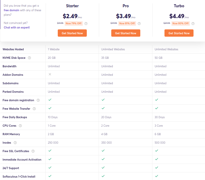 • Free domain and SSL certificate in most plans.